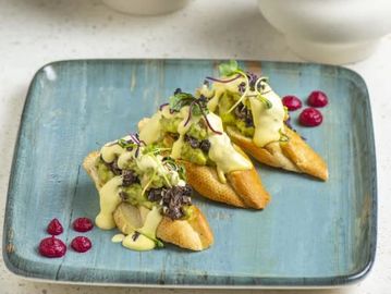 GRILLED FRENCH BREAD, TOPPED WITH BEEF TIKKA, SMASHED AVOCADO, SPICY HOLLANDAISE SAUCE.