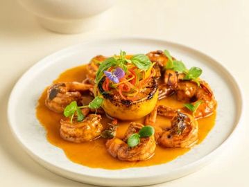 Charred Herb-Marinated Shrimp Juicy shrimp grilled to perfection with organic herbs and zesty lemon, drizzled with a delicate Tabasco-infused sauce and finished with microgreens for a vibrant touch.